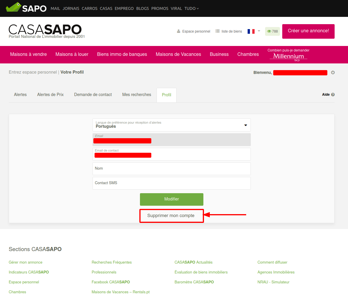 L'utilisateur peut supprimer son compte à tout moment, via https://casa.iol.pt/AreaPessoal/AreaPessoal.aspx?MCSPage=userProfile.